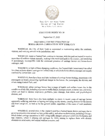 FINAL Executive Order No. 56 as it relates to the Preparing for the Cessation of Horse-Drawn Carriages in New York City, dated September 17, 2025; shall take effect immediately.