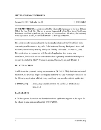 IN THE MATTER OF an application filed by Vlacich LLC pursuant to Sections 200 and 201 of the New York City Charter, to amend Appendix F of the New York City Zoning Resolution establishing and mapping the area to be rezoned as a Mandatory Inclusionary Housing Area in Astoria, Community District 1 etc