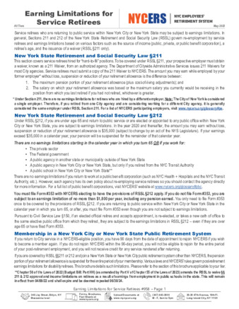 This brochure describes the earnings limitations that service and disability retirees may be subject to if they decide to return to public service within New York City or New York State.