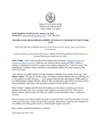 MAYOR ADAMS RELEASES BLUEPRINT TO END GUN VIOLENCE IN NEW YORK CITY