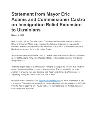 New York City Mayor Eric Adams and Commissioner Manuel Castro of the Mayor’s Office of Immigrant Affairs today releases a statement in response to President Biden extending Temporary Protected Status to tens of thousands of Ukrainian immigrants living in the United States: