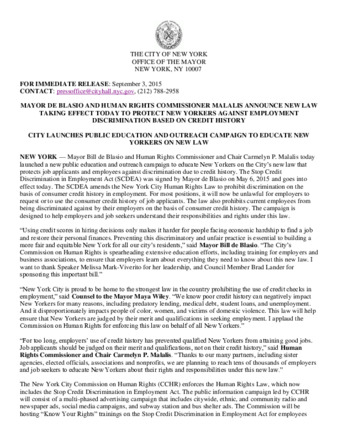 Mayor's Press Release: MAYOR DE BLASIO AND HUMAN RIGHTS COMMISSIONER MALALIS ANNOUNCE NEW LAW TAKING EFFECT TODAY TO PROTECT NEW YORKERS AGAINST EMPLO