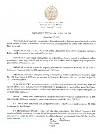 Emergency Executive Order No. 218, extends Emergency Executive Order No. 213, dated September 22, 2022, for five (5) days, if this relates to the Monkeypox virus.