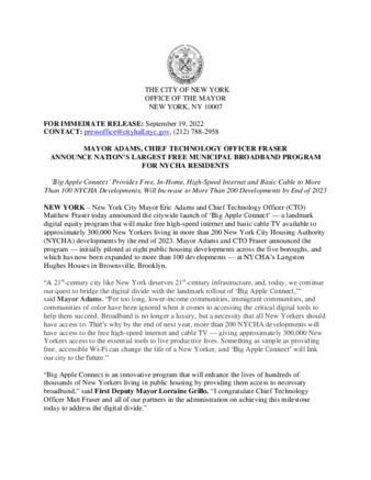 MAYOR ADAMS, CHIEF TECHNOLOGY OFFICER FRASER ANNOUNCE NATION’S LARGEST FREE MUNICIPAL BROADBAND PROGRAM FOR NYCHA RESIDENTS