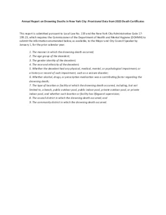 The Annual Report on Drowning Deaths in New York City is submitted pursuant to Local Law 159 of 2023 and reports data from year 2024.