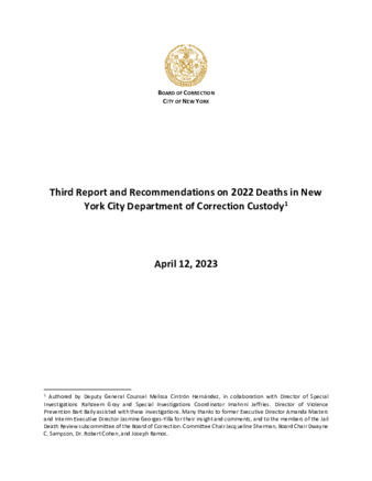 Third Report and Recommendations on 2022 Deaths in New York City Department of Correction Custody