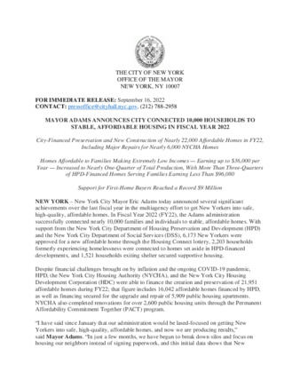 MAYOR ADAMS ANNOUNCES CITY CONNECTED 10,000 HOUSEHOLDS TO STABLE, AFFORDABLE HOUSING IN FISCAL YEAR 2022