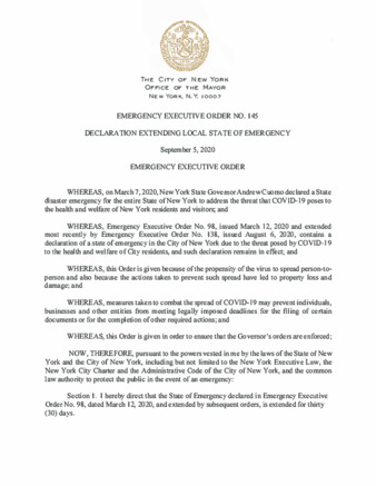 The Mayor of New York City extends a State of Emergency due to the threat posed by the spread of Covid-19.