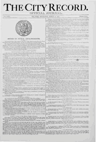 The City Record newspaper publishes notices which includes but is not limited to: public hearings and meetings, public auctions and sales, solicitations and awards and official rules proposed and adopted by city agencies. This is the City Record Newspaper for August 21, 1901.