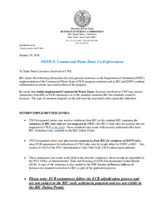 Trade Waste Licensees Involved in CWZ: BIC shares the following information for your general awareness- Be aware that within implemented Commercial Waste Zones, licensees involved in CWZ may receive summonses from BIC as ECB summonses or in the standard summons BIC has routinely issued to licensees.