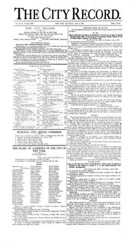 The City Record newspaper publishes notices which includes but is not limited to: public hearings and meetings, public auctions and sales, solicitations and awards and official rules proposed and adopted by city agencies. This is the City Record Newspaper for July 08, 1915.