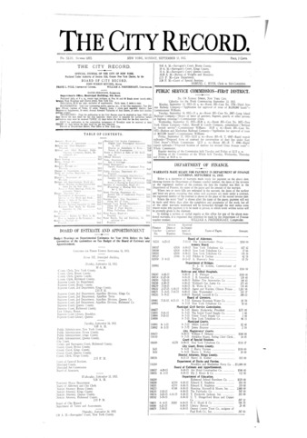 The City Record newspaper publishes notices which includes but is not limited to: public hearings and meetings, public auctions and sales, solicitations and awards and official rules proposed and adopted by city agencies. This is the City Record Newspaper for September 13, 1915.