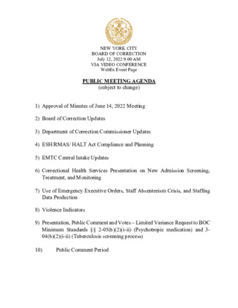 Board of Correction's agenda for the July Public Meeting, including DOC updates, ESH, and EMTC Centralized Intake