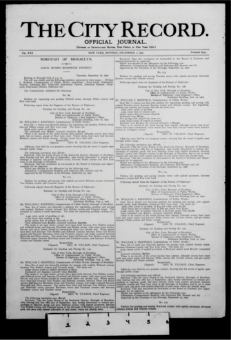 The City Record newspaper publishes notices which includes but is not limited to: public hearings and meetings, public auctions and sales, solicitations and awards and official rules proposed and adopted by city agencies. This is the City Record Newspaper for December 01, 1902.