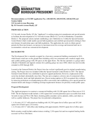 Recommendation on ULURP Application Nos. 240248ZSM, 240249ZSM, 240246ZSM and N240247ZRM 515 Seventh Avenue Rezoning