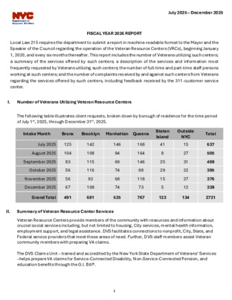 Local Law 215 requiring the department to submit a report in machine-readable format to the Mayor and the Speaker of the Council regarding the operation of the Veteran Resource Centers (VRCs) for July 2025 to December 2025