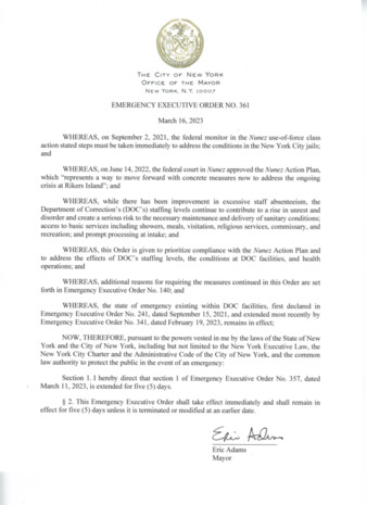 Emergency Executive Order No. 361, is being submitted to extend Emergency Executive Order No. 357, dated March 11, 2023, for five (5) days, if this relates to Rikers.
