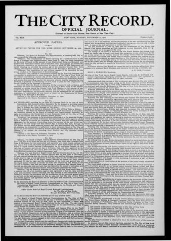 The City Record newspaper publishes notices which includes but is not limited to: public hearings and meetings, public auctions and sales, solicitations and awards and official rules proposed and adopted by city agencies. This is the City Record Newspaper for November 24, 1902.