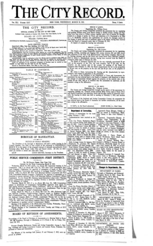 The City Record newspaper publishes notices which includes but is not limited to: public hearings and meetings, public auctions and sales, solicitations and awards and official rules proposed and adopted by city agencies. This is the City Record Newspaper for March 19, 1913 with supplement.