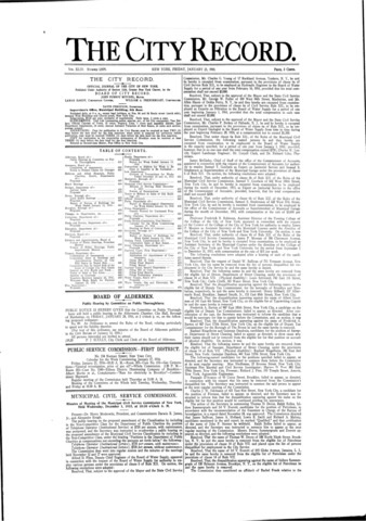The City Record newspaper publishes notices which includes but is not limited to: public hearings and meetings, public auctions and sales, solicitations and awards and official rules proposed and adopted by city agencies. This is the City Record Newspaper for January 21, 1916.