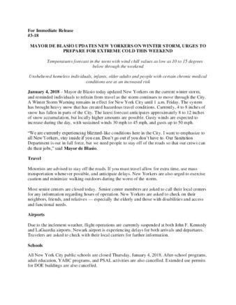 Press Release: MAYOR DE BLASIO UPDATES NEW YORKERS ON WINTER STORM, URGES TO PREPARE FOR EXTREME COLD THIS WEEKEND
