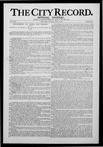 The City Record newspaper publishes notices which includes but is not limited to: public hearings and meetings, public auctions and sales, solicitations and awards and official rules proposed and adopted by city agencies. This is the City Record Newspaper for June 24, 1902.