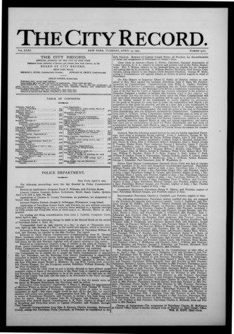 The City Record newspaper publishes notices which includes but is not limited to: public hearings and meetings, public auctions and sales, solicitations and awards and official rules proposed and adopted by city agencies. This is the City Record Newspaper for April 14, 1903.
