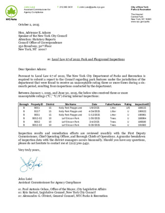 Local Law 67 of 2022: Park and Playground Inspections January-June 2025