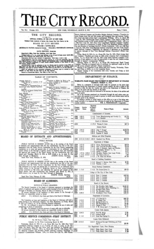 The City Record newspaper publishes notices which includes but is not limited to: public hearings and meetings, public auctions and sales, solicitations and awards and official rules proposed and adopted by city agencies. This is the City Record Newspaper for March 12, 1913 with supplement.