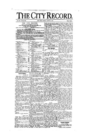 The City Record newspaper publishes notices which includes but is not limited to: public hearings and meetings, public auctions and sales, solicitations and awards and official rules proposed and adopted by city agencies. This is the City Record Newspaper for August 11, 1914.