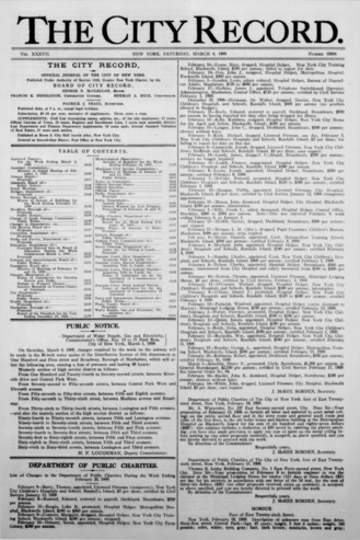 The City Record newspaper publishes notices which includes but is not limited to: public hearings and meetings, public auctions and sales, solicitations and awards and official rules proposed and adopted by city agencies. This is the City Record Newspaper for March 06, 1909.