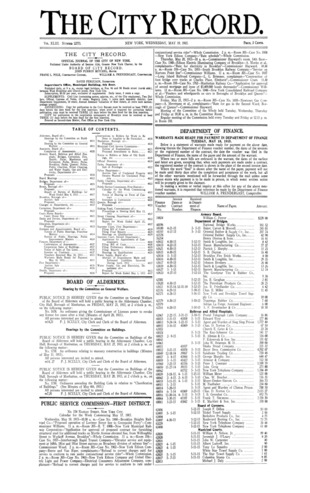 The City Record newspaper publishes notices which includes but is not limited to: public hearings and meetings, public auctions and sales, solicitations and awards and official rules proposed and adopted by city agencies. This is the City Record Newspaper for May 19, 1915.