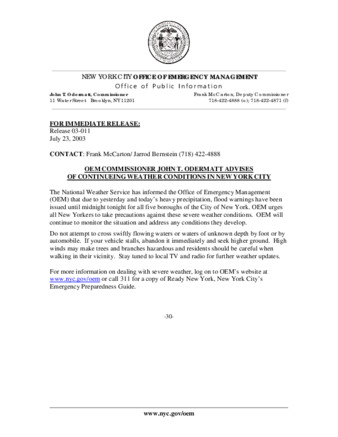 Press releases are designed to inform the public of an upcoming/ongoing emergency or special event. Some emergencies include coastal storms, nor'easters, and extreme heat. Releases also highlight special events including Ready New York presentations and other community preparedness initiatives.