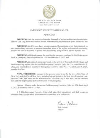 Emergency Executive Order No. 378, is being submitted to extend Emergency Executive Order No. 374, dated April 5, 2023, for five (5) days, if this relates to the state of emergency based on the arrival of thousands of individuals and families seeking asylum.