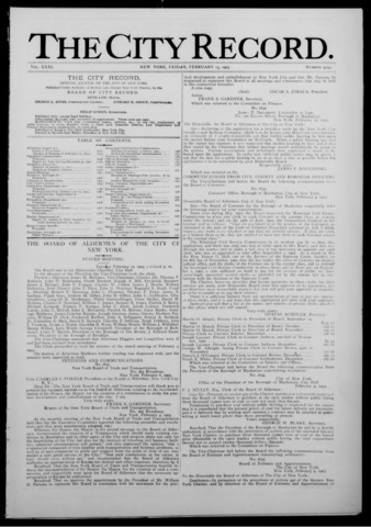 The City Record newspaper publishes notices which includes but is not limited to: public hearings and meetings, public auctions and sales, solicitations and awards and official rules proposed and adopted by city agencies. This is the City Record Newspaper for February 13, 1903.