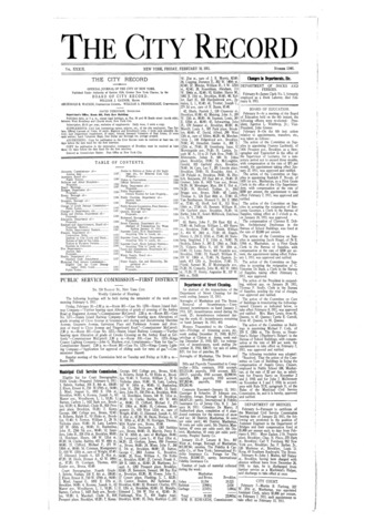 The City Record newspaper publishes notices which includes but is not limited to: public hearings and meetings, public auctions and sales, solicitations and awards and official rules proposed and adopted by city agencies. This is the City Record Newspaper for February 10, 1911.