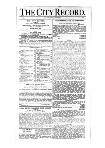 The City Record newspaper publishes notices which includes but is not limited to: public hearings and meetings, public auctions and sales, solicitations and awards and official rules proposed and adopted by city agencies. This is the City Record Newspaper for August 02, 1912.