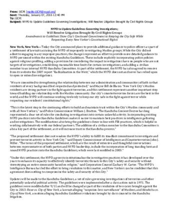 Mayor's Press Release: NYPD to Update Guidelines Governing Investigations; Will Resolve Litigation Brought By Civil Rights Groups