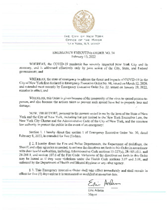 Emergency Executive Order 34 extends Emergency Executive Order 30, dated February 8, 2022 by 5 days. It relates to the City's response to the COVID-19 pandemic.