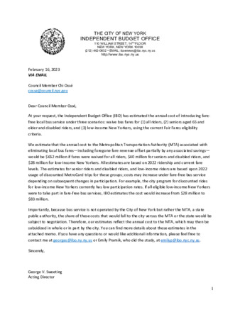 At the request of Council Member Chi Ossé, the IBO estimated the annual cost of introducing fare-free local bus service in New York City under three scenarios: waive bus fares for all riders, riders who are 65 or older or who have disabilities, and New Yorkers who are low income.