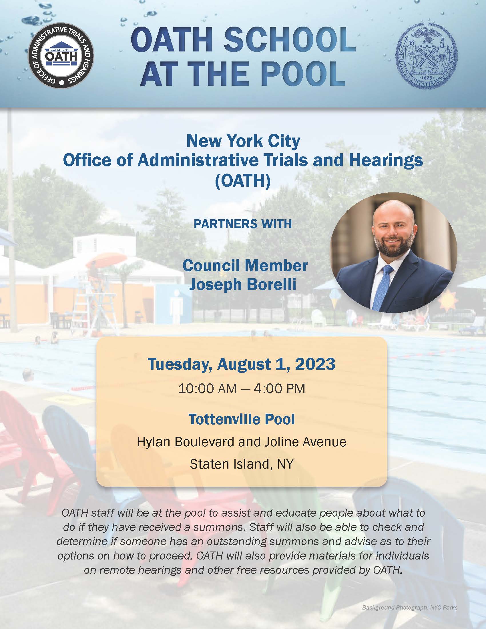 OATH staff were at the pool to assist and educate people about what to do should they have received a summons and to check to determine if someone has an outstanding summons. Materials about remote hearings and other free resources were provided to the public as well.