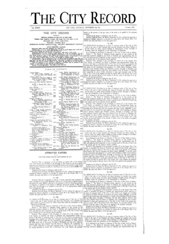 The City Record newspaper publishes notices which includes but is not limited to: public hearings and meetings, public auctions and sales, solicitations and awards and official rules proposed and adopted by city agencies. This is the City Record Newspaper for September 30, 1911.