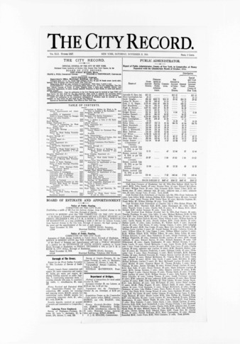 The City Record newspaper publishes notices which includes but is not limited to: public hearings and meetings, public auctions and sales, solicitations and awards and official rules proposed and adopted by city agencies. This is the City Record Newspaper for November 21, 1914.