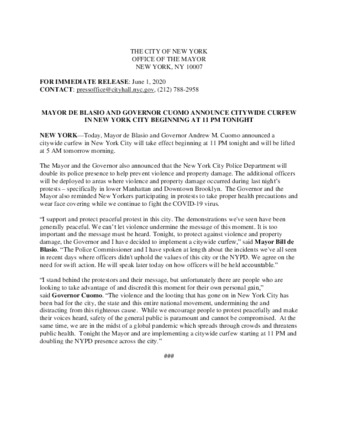 Mayor's Press Release: MAYOR DE BLASIO AND GOVERNOR CUOMO ANNOUNCE CITYWIDE CURFEW IN NEW YORK CITY BEGINNING AT 11 PM TONIGHT