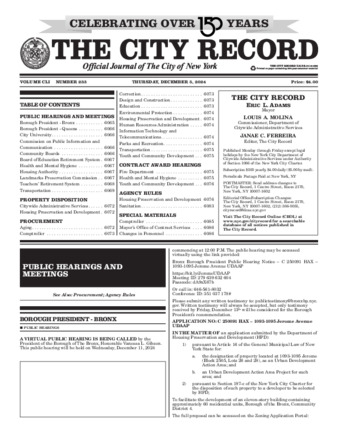 The City Record newspaper publishes notices which includes but is not limited to public hearings and meetings, public auctions and sales, solicitations and awards and official rules proposed and adopted by city agencies.
