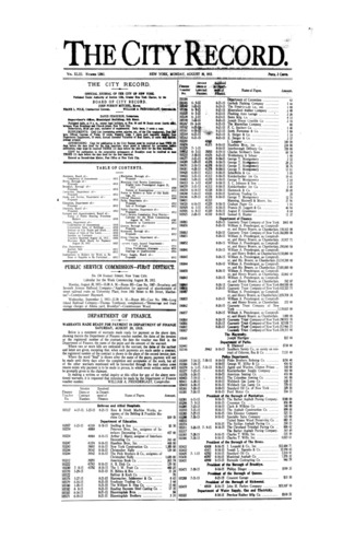 The City Record newspaper publishes notices which includes but is not limited to: public hearings and meetings, public auctions and sales, solicitations and awards and official rules proposed and adopted by city agencies. This is the City Record Newspaper for August 29, 1915.