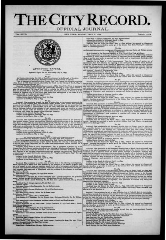 The City Record newspaper publishes notices which includes but is not limited to: public hearings and meetings, public auctions and sales, solicitations and awards and official rules proposed and adopted by city agencies. This is the City Record Newspaper for May 08, 1899.