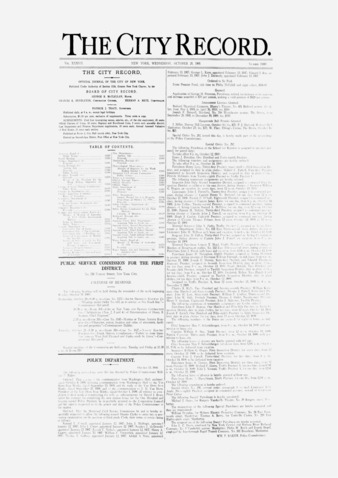 The City Record newspaper publishes notices which includes but is not limited to: public hearings and meetings, public auctions and sales, solicitations and awards and official rules proposed and adopted by city agencies. This is the City Record Newspaper for October 20, 1909.