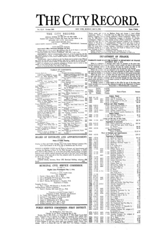 The City Record newspaper publishes notices which includes but is not limited to: public hearings and meetings, public auctions and sales, solicitations and awards and official rules proposed and adopted by city agencies. This is the City Record Newspaper for May 08, 1916.