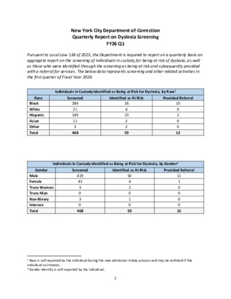 Pursuant to Local Law 138 of 2023, this report provides information regarding dyslexia screening and referrals for enrollment in evidence-based intervention programs in city jails.